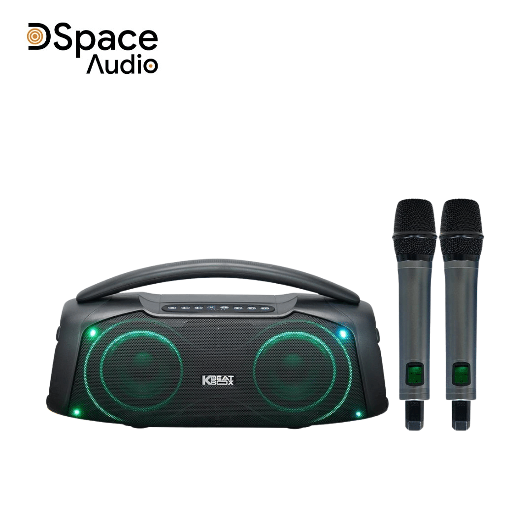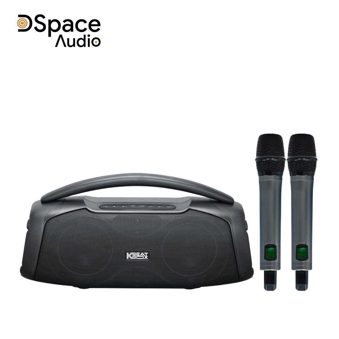 Logo KBEATBOX được đặt ở vị trí trung tâm, tăng khả năng nhận diện thương hiệu và tạo điểm nhấn tổng thể.Phía trên thân loa là tay xách nhôm liền khối, chắc chắn, độ cong vừa phải, giúp cầm nắm ổn định khi mang loa đi xa hoặc đặt ở các vị trí khác nhau.