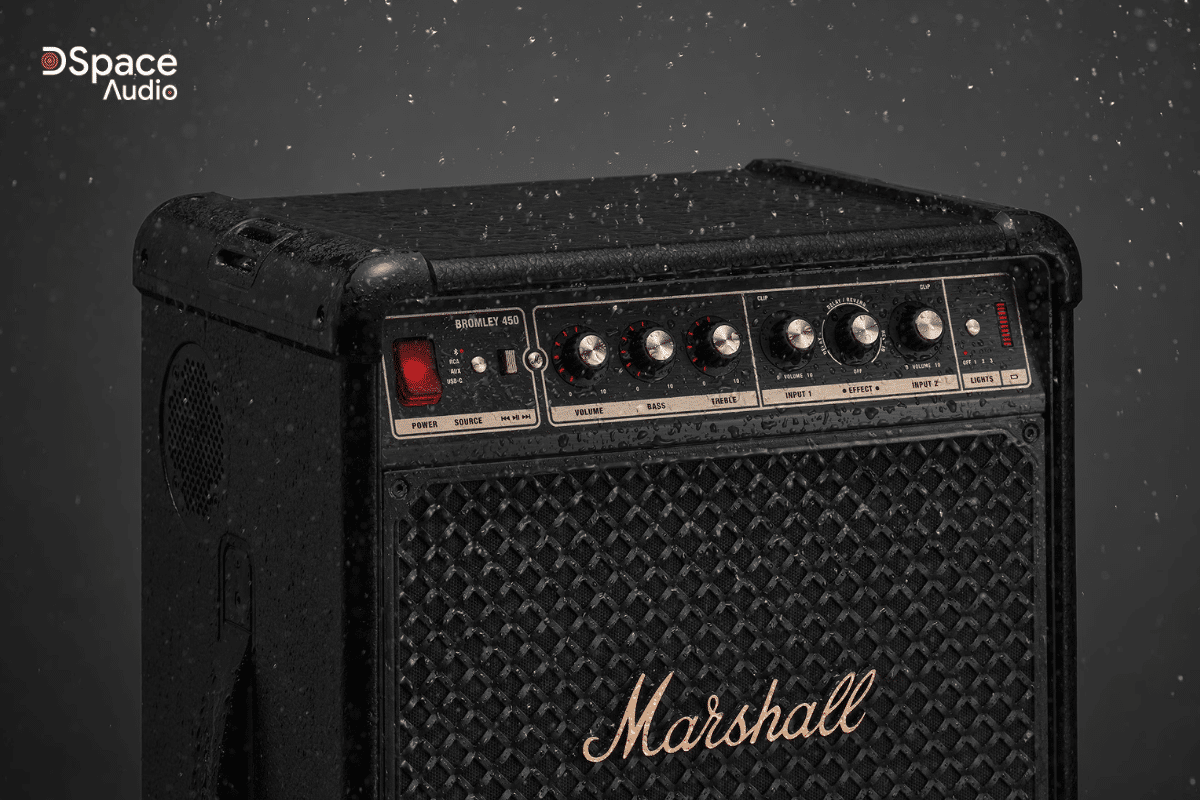 Bảng điều khiển vật lý phía trên Marshall Bromley 450 giúp người dùng kiểm soát toàn bộ âm thanh và ánh sáng một cách trực quan. Các khu chức năng được bố trí rõ ràng để bật nguồn, điều chỉnh âm lượng và hiệu ứng ánh sáng. Núm vặn volume, bass, treble có độ ma sát hợp lý giúp tinh chỉnh chính xác, hạn chế thay đổi ngoài ý muốn khi di chuyển.