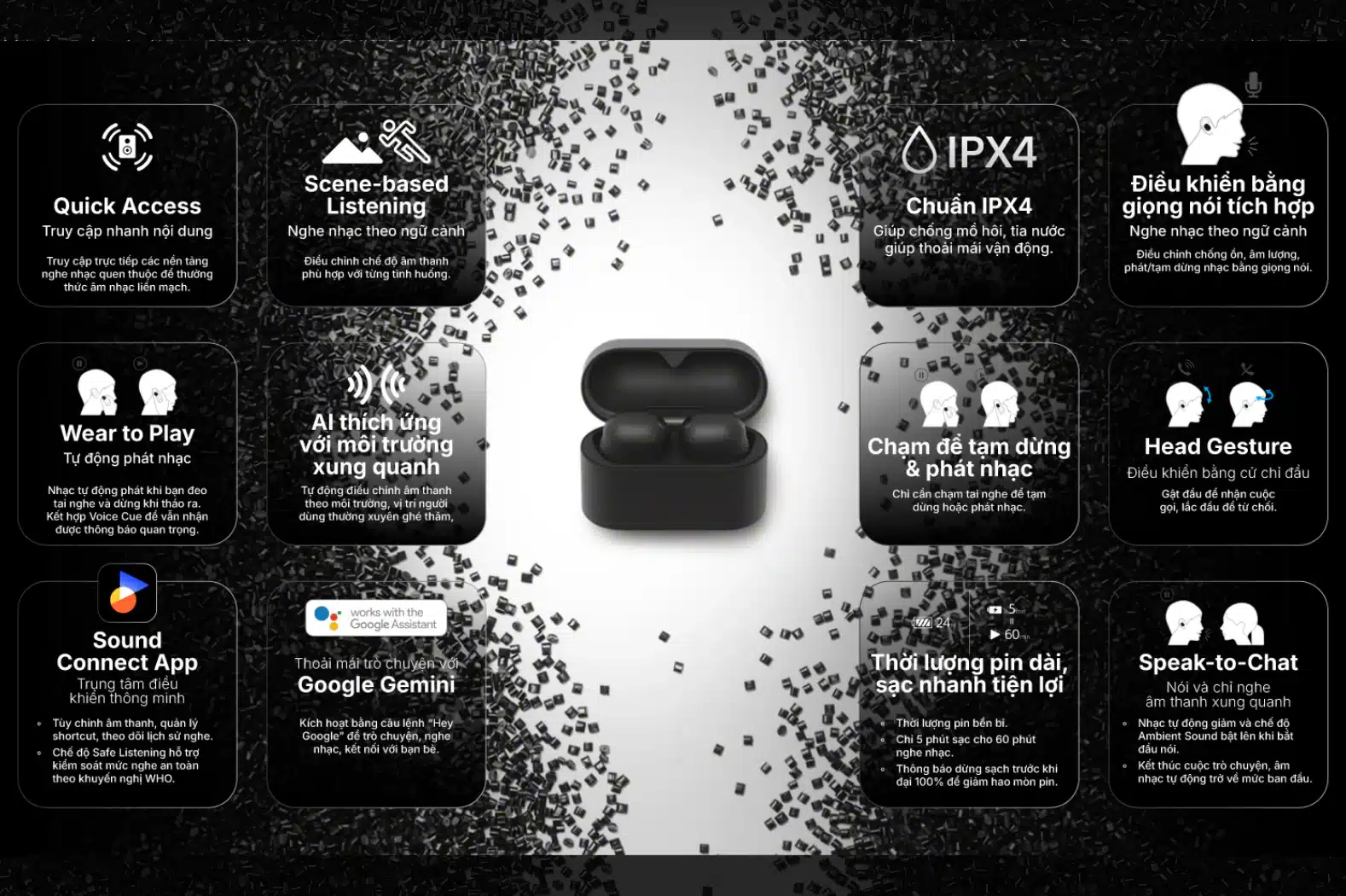 Bên cạnh chất lượng âm thanh và cuộc gọi, Tai nghe Sony WF-1000XM6 còn được trang bị nhiều tính năng nghe thông minh nhằm tối ưu trải nghiệm sử dụng hàng ngày. Các công nghệ này có khả năng dự đoán nội dung bạn muốn nghe, cách bạn muốn nghe cũng như thời điểm cần trò chuyện. Tai nghe hỗ trợ âm thanh thích ứng, tính năng phát lại tự động, cùng khả năng điều khiển thông qua ứng dụng, giọng nói hoặc cử chỉ, giúp mọi thao tác trở nên thuận tiện và liền mạch suốt cả ngày.